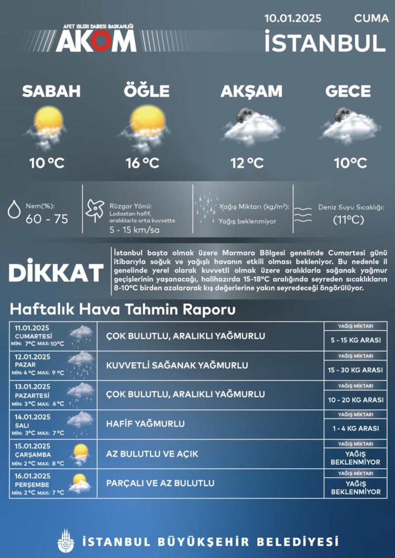 İstanbul Büyükşehir Belediyesi Afet İşleri Dairesi Başkanlığı (AKOM) hafta sonundan itibaren İstanbul’da soğuk ve yağışlı havanın etkili olacağı uyarısında bulundu.
