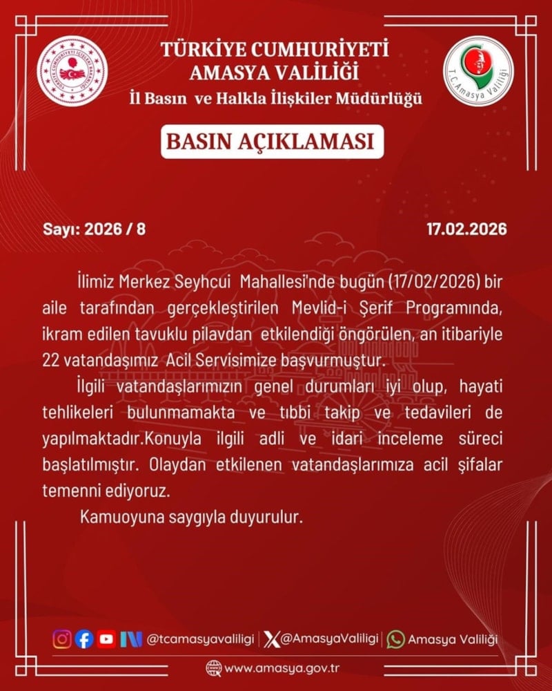 "Bir aile tarafından gerçekleştirilen Mevlid-i Şerif programında ikram edilen tavuklu pilavdan etkilendiği öngörülen, an itibariyle 22 vatandaşımız acil servisimize başvurmuştur. İlgili vatandaşlarımızın genel durumları iyi olup, hayati tehlikeleri bulunmamakta ve tıbbi takip ve tedavileri de yapılmaktadır. Konuyla ilgili adli ve idari inceleme süreci başlatılmıştır. Olaydan etkilenen vatandaşlarımıza acil şifalar temenni ediyoruz"