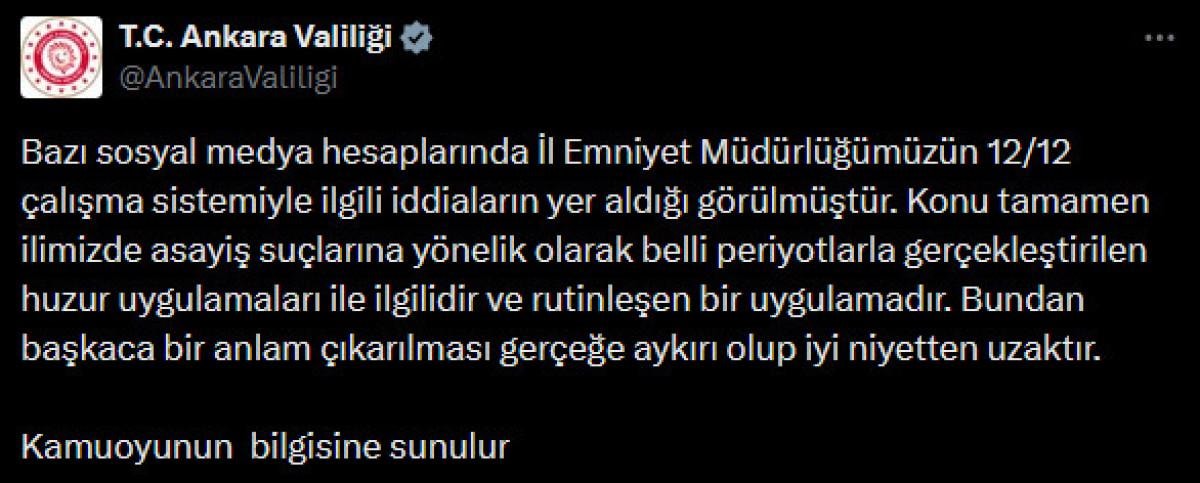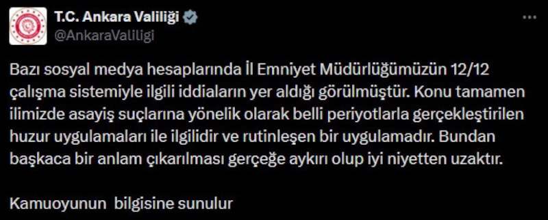 Ankara Valiliği, Ankara İl Emniyet Müdürlüğü’nde 12/12 çalışma sisteminin uygulandığı yönündeki iddialara ilişkin açıklama yaptı.
