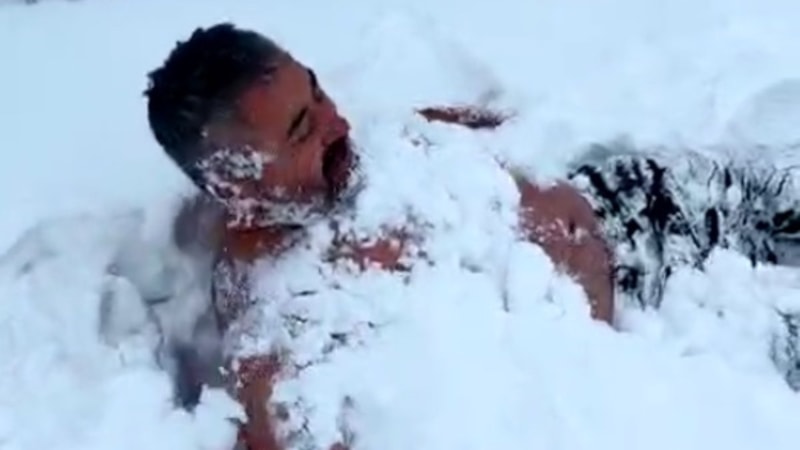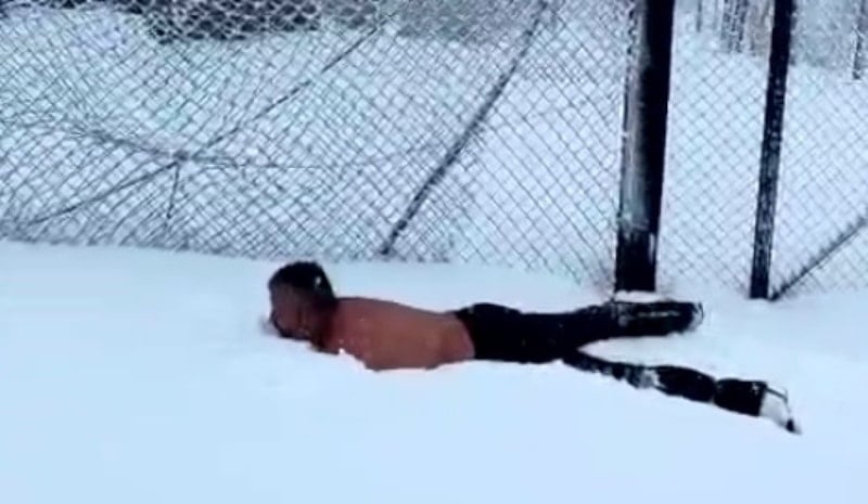 Zorlu parkurun tamamlanmasının ardından grup üyelerinden biri, aracından inerek soğuk havaya rağmen üstünü çıkardı. Ardından kendini karın üzerine bırakan vatandaş, kar banyosu yaparak dikkatleri üzerine çekti.