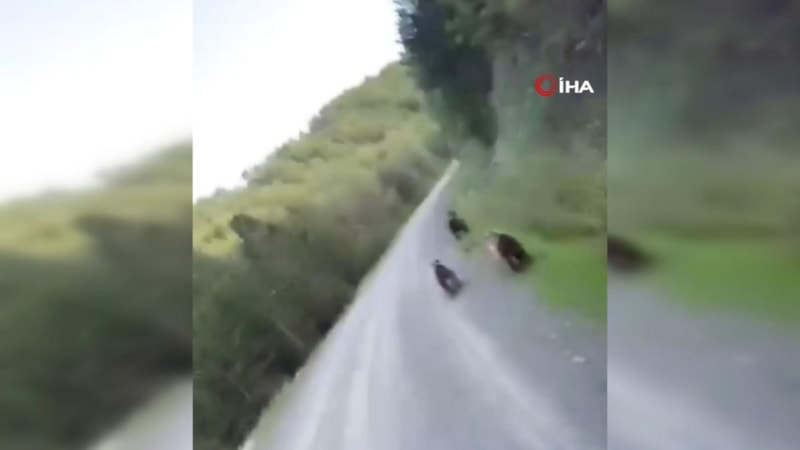 Ayılara çarpmamak için yavaşlayan vatandaş o anları cep telefonu kamerasına kaydetti.