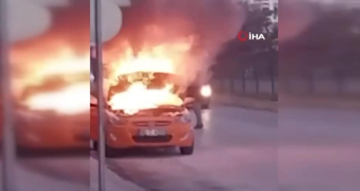 Alevleri fark eden ticari taksi şoförü aracı yolun kenarına çekerek kendi imkanlarıyla söndürmeye çalıştı.