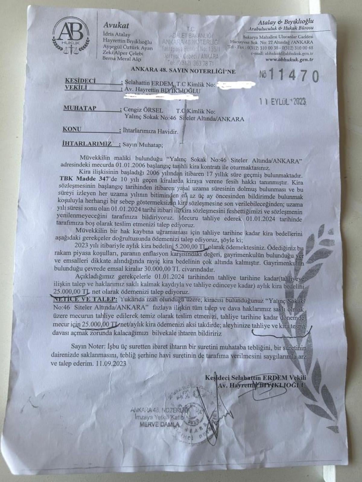 İş yeri sahibi Selahattin Erdem’in 25 bin lira kira istediğini, gönderdiği ihtarnameden öğrendiğini söyleyen Örsel, “Bu kira artışını, buralarda kira artışlarının güya 30 bin lira olduğu gerekçesiyle istiyor. Burada kimse 30 bin lira ödemiyor. Genelde buralarda zemin katlar 5 bin lira kira ödüyor. İhtarnamede yazdığı gibi kimse 30 bin lira kira ödemiyor burada.” dedi.