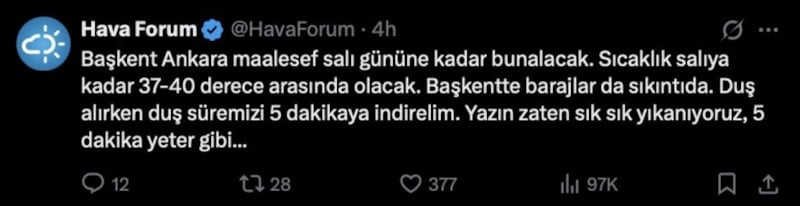 “Başkent Ankara maalesef salı gününe kadar bunalacak. Sıcaklık salıya kadar 37-40 derece arasında olacak. Başkentte barajlar da sıkıntıda. Duş alırken duş süremizi 5 dakikaya indirelim. Yazın zaten sık sık yıkanıyoruz, 5 dakika yeter gibi…”