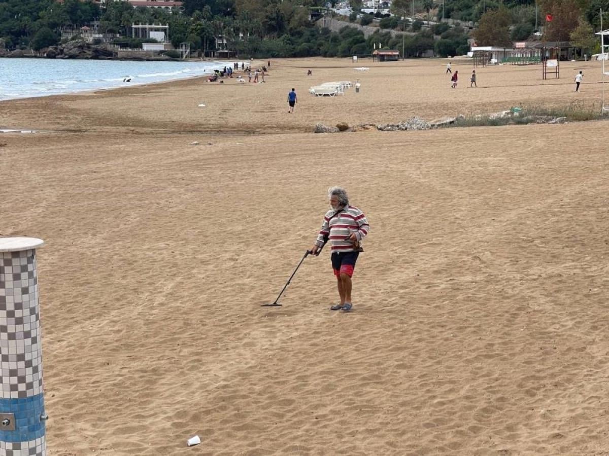 Turistlerin düşürdüğü metal eşya, altın bilezik, kolye, yüzük, gümüş ve madeni paraları dedektörle arayan define avcıları sahili karış karış gezdi.