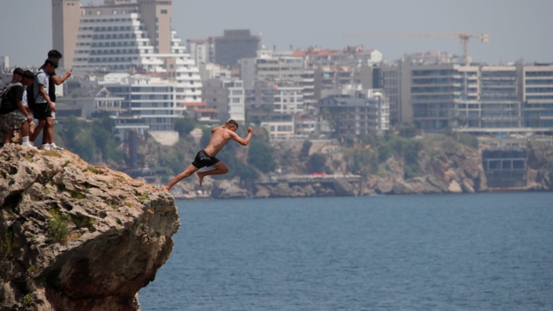 Konyaaltı Sahili'nde adrenalin tutkunu gençlerin 30 metre yüksekliğindeki falezlerden denize yaptıkları tehlikeli atlayış, izleyenlerin yüreklerini ağzına getirdi.