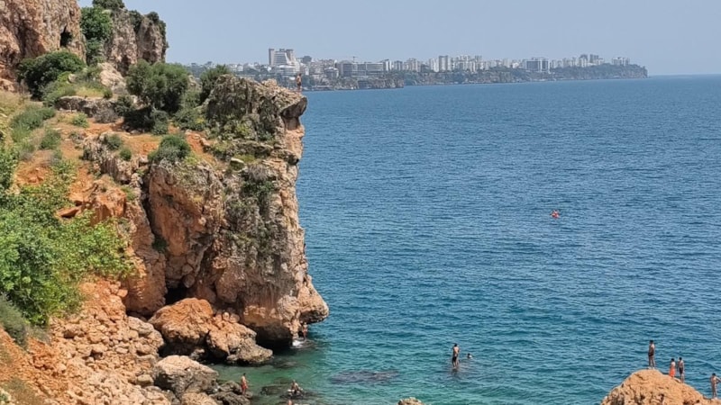 Konyaaltı Sahili'nde yaklaşık 30 metrelik falezler, manzarasıyla görenleri büyülerken adrenalin tutkunu gençlerin tehlikeli eğlencesine de sahne oluyor.