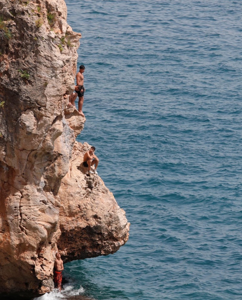 Bazı gençler denize yakın 5 metrelik kayalık alandan kendilerini boşluğa bırakırken, bir genç ise sahilde denize giren vatandaşların şaşkın bakışları arasında falezlerin yaklaşık 30 metrelik zirve noktasına çıktı.