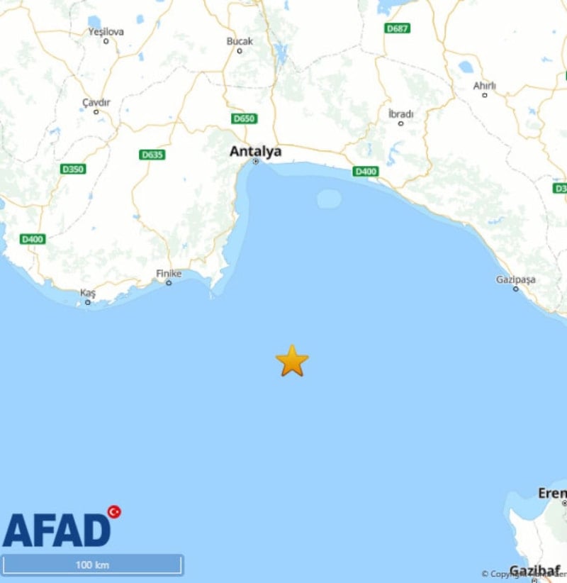 Deprem, AFAD'ın verilerine göre Antalya'nın Kumluca ilçesine 68.39 kilometre uzaklıktaki meydana geldi.