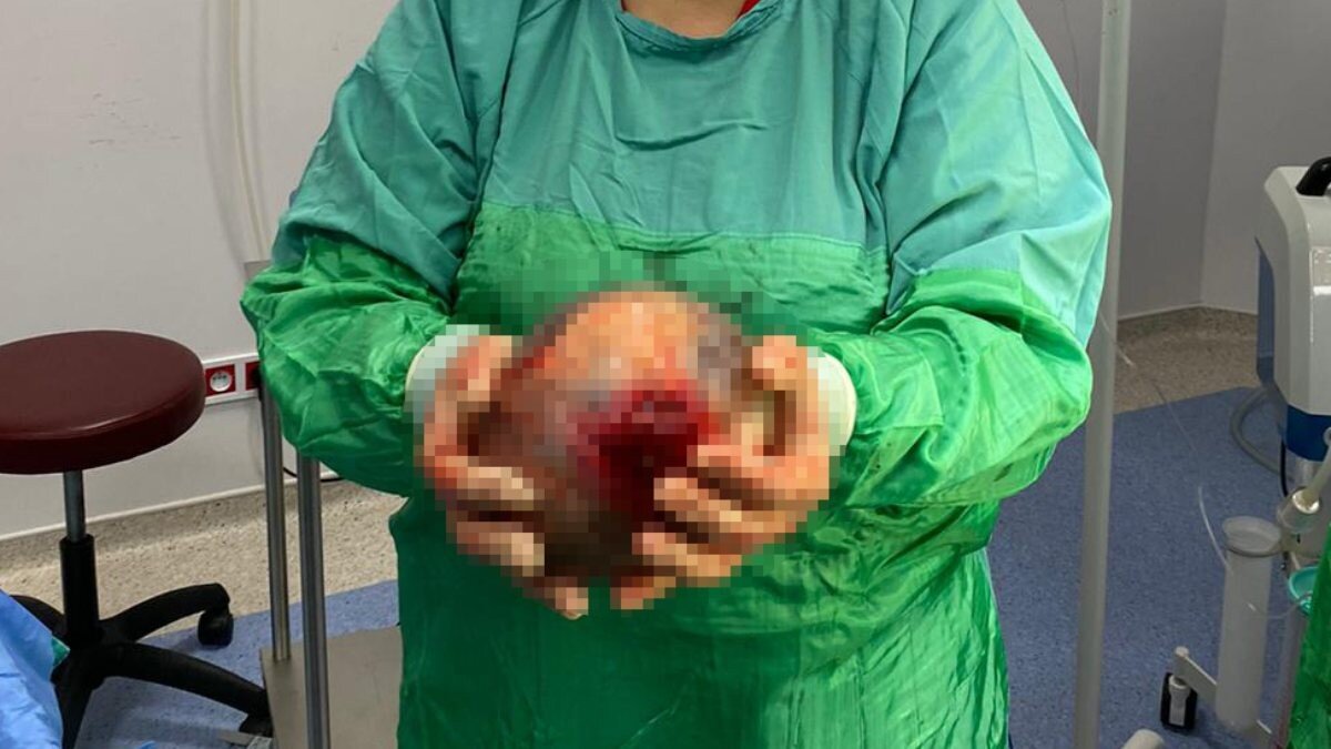 Ameliyat sonunda kadının rahminde bulunan, 18 santim çapında 1,5 kiloluk kist alındı.