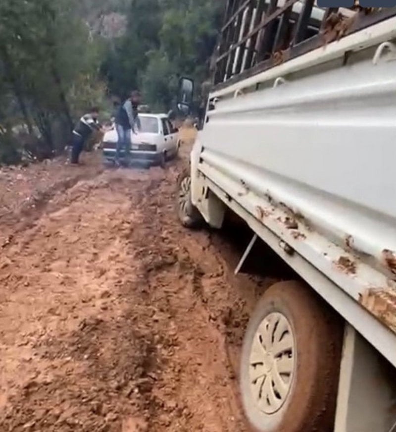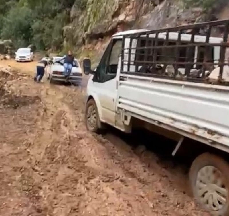 Çamurla kaplanan yol, sürücüler için adeta offroad parkuruna dönüşürken bazı araçlar ilerlemekte güçlük çekti.