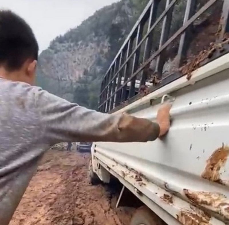 Yoldan geçmeye çalışan başka bir araçta ise kaymayı önlemek için bagaj kısmına bir kişinin oturduğu görüldü. Çamura saplanan kamyonet, daha sonra bir traktör yardımıyla bulunduğu yerden çıkarıldı.