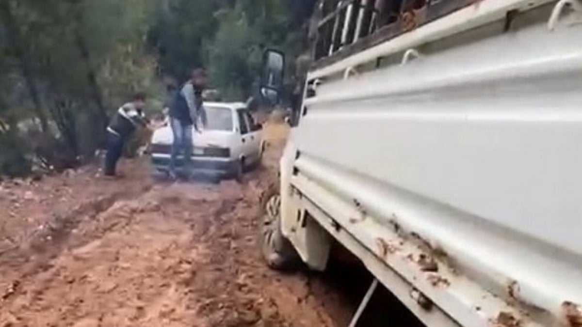 Çamurlu yoldan geçmeye çalışan bir kamyonet, zeminin kaygan olması nedeniyle kontrolden çıkarak yol kenarındaki şarampole saplandı. O anlar, olay yerinde bulunan bir vatandaş tarafından cep telefonu kamerasıyla kaydedildi.