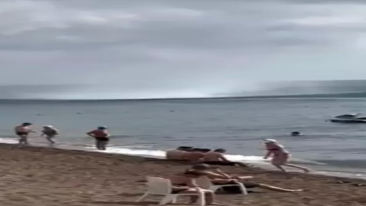 Sahilde olan insanlar, panik halinde sağa sola kaçışırken deniz şemsiyeleri ve şezlongların havada uçuştuğu görüldü.