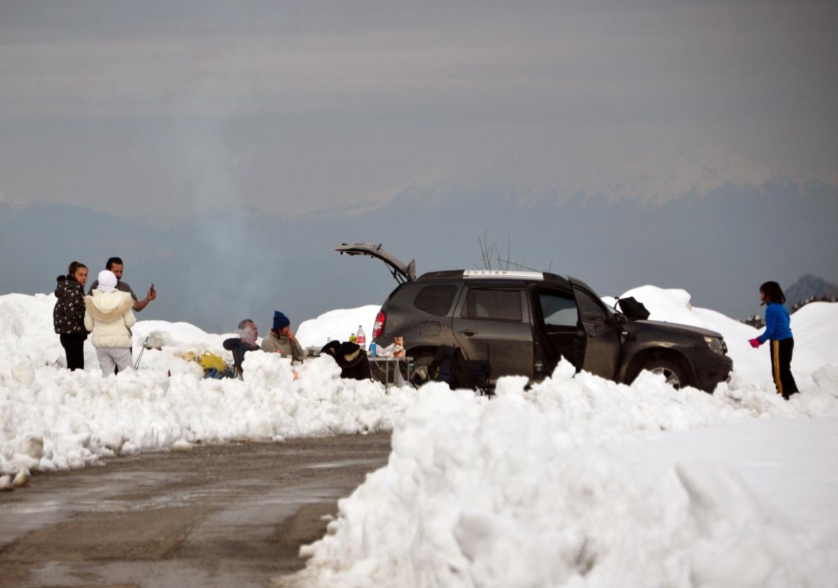 Yüzlerce kişi, beyaza bürünen dağlarda aileleri ile birlikte kar ve mangal keyfi yaptı.