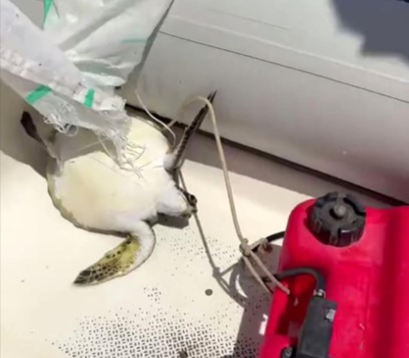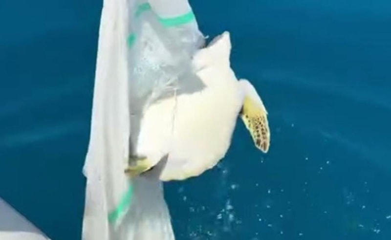 Görüntülerde, balıkçıların tedirgin bir şekilde misina ve çuvalı keserken, kaplumbağayı bıraktıktan sonra birbirlerine "Bizim köylü, hadi yürü" dedikleri duyuluyor.