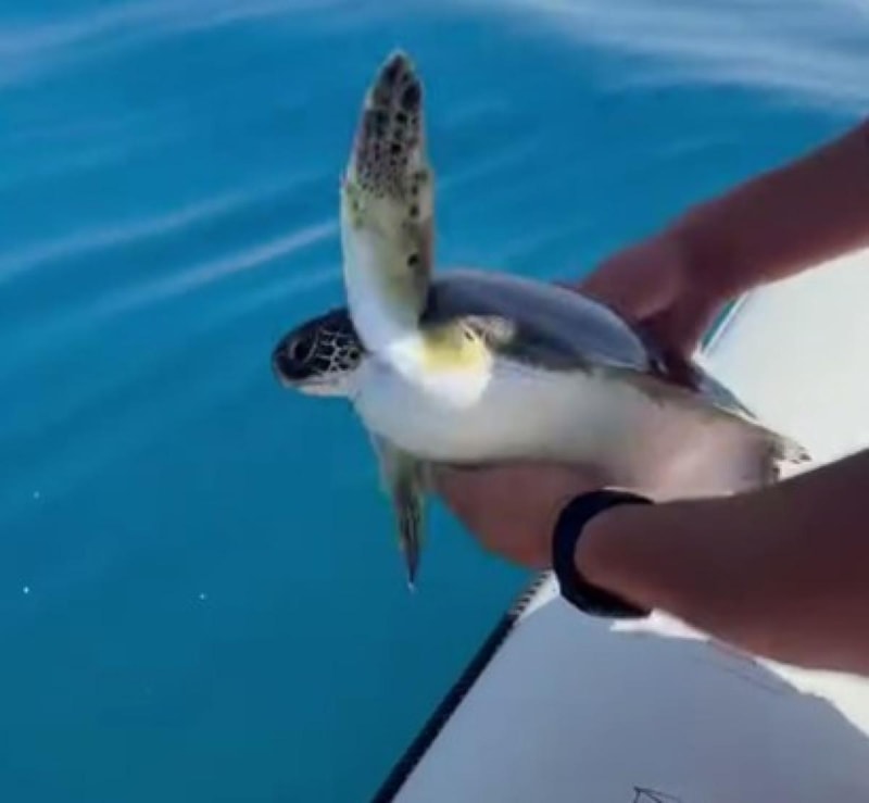 Ardından, özgürlüğüne kavuşan deniz kaplumbağası, balıkçılar tarafından güvenle denize bırakıldı. Balıkçılar, bu kurtarma anlarını cep telefonlarıyla kaydetmeyi ihmal etmedi.