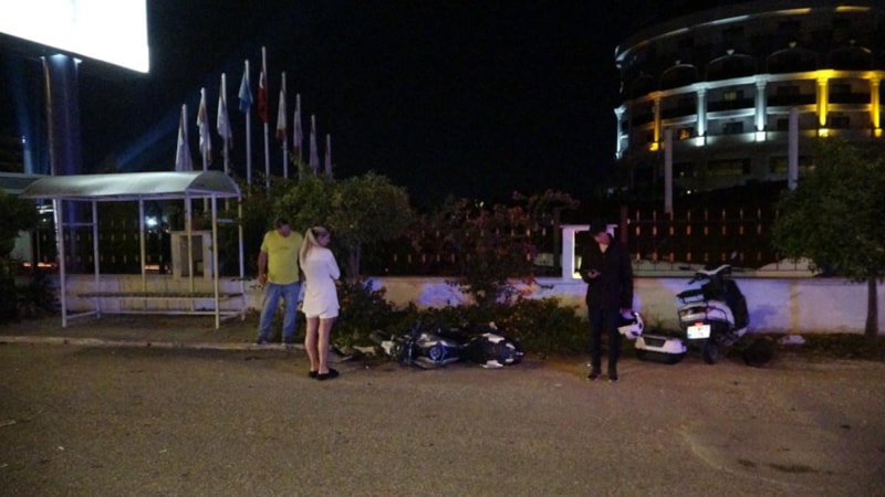 Akşam otelin kapısına gelerek, otele dönmek için bekledikleri sırada Marlon Sky Wedder’in kullandığı 07 BFC 775 plakalı motosiklete, aynı istikamette seyir halindeki Ahmet Nalbant’ın (22) kullandığı 07 BAN 641 plakalı motosiklet arkadan çarptı.