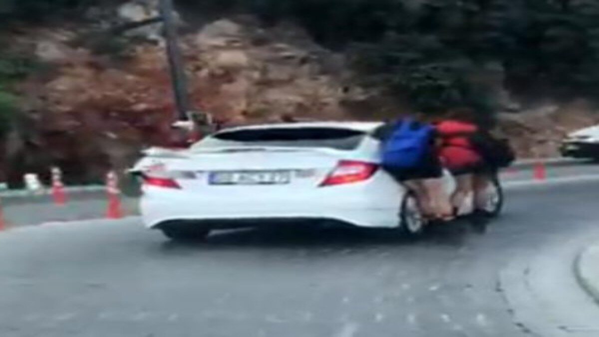 Yokuşu çıkarken otomobile tutunan genç kızlar, patenlerinin arasına taş girmesine, ayaklarının burkulmasına ya düşüp yaralanma riskine aldırmadan tehlikeli yolculuğuna devam etti.