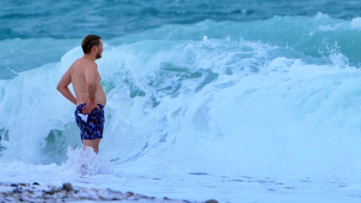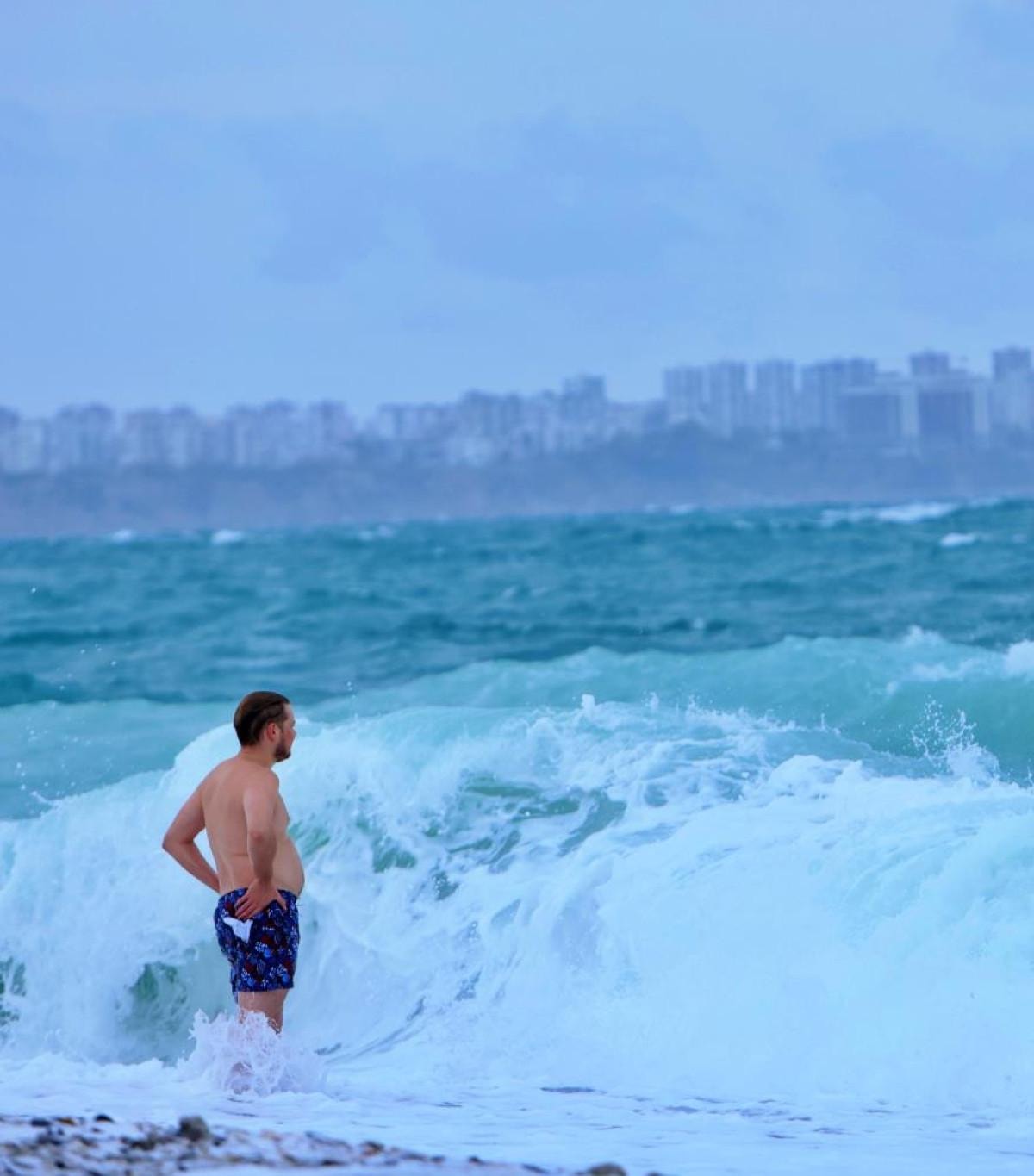 Rüzgarın etkisiyle uçmakta zorlanan martı ve kargaların aksine, denizle mücadele eden Rus turist, Antalya'nın havasını çok beğendiğini belirterek, "Deniz ve hava harika. Soğuk değil, sıcak. Neden ceket giyiyorsunuz, gerçekten sizi anlamıyorum" dedi. Ardından dalgalar arasında denize girmeye devam etti.
