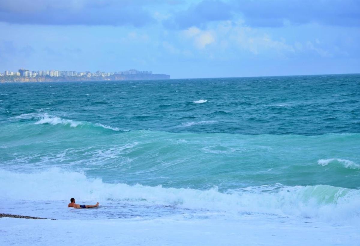 Dünyaca ünlü Konyaaltı Sahili'nde rüzgarın etkisiyle dev dalgalar oluştu. Sahile gelenler, oluşan manzarayı cep telefonlarıyla kaydederken, bir Rus turist ise denizin keyfini sürmeye devam etti.