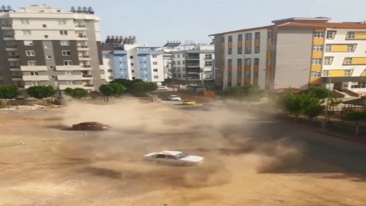 Muratpaşa ilçesi Kızılarık mahallesinde, etrafı binalarla ve apartmanlarla çevrili toprak alana gelen kimliği belirsiz sürücülerin kullandığı 3 araç, büyük bir gürültü ile drift atmaya başladı.