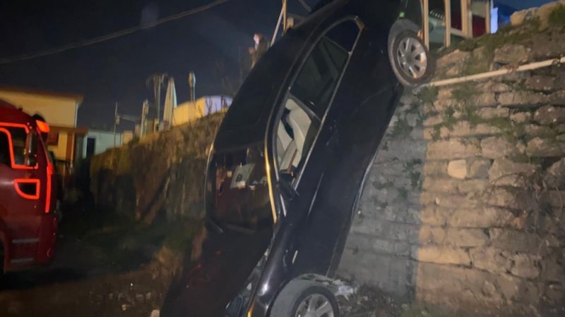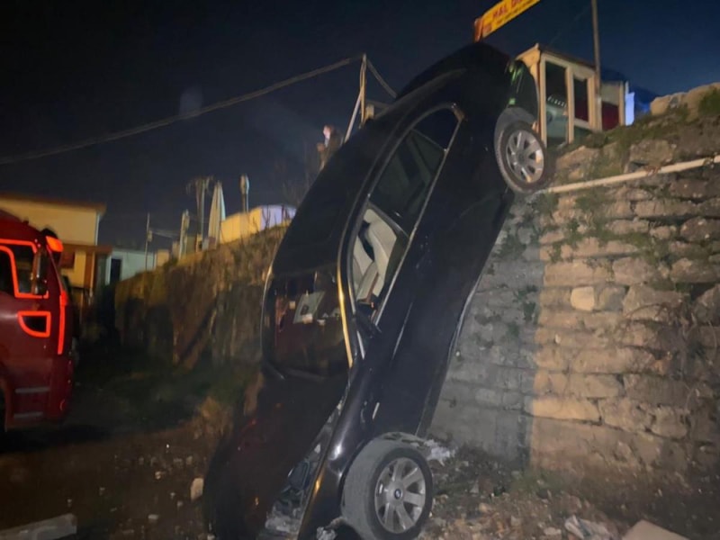 Serik ilçesinde yolu şaşıran sürücü otomobiliyle, 5 metre yükseklikteki istinat duvarından park halindeki tırların arasına düştü. Sürücü kazayı yara almadan atlattı.