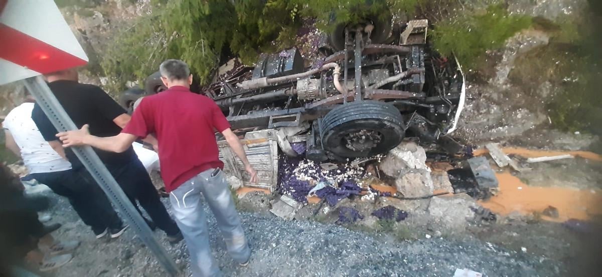 Antalya’da dün saat 20.00 sıralarında Akseki-Manavgat karayolu Manayıt mevkiinde Osman Öztürk (60) idaresindeki 07 LEG 98 plakalı yumurta yüklü kamyon Manayıt mevkiinde virajı alamayıp yolun kenarındaki kayalık ve taşlık alana doğru savrulup ters döndü.