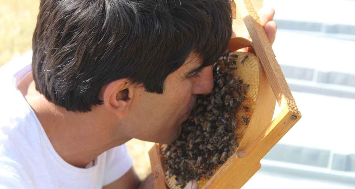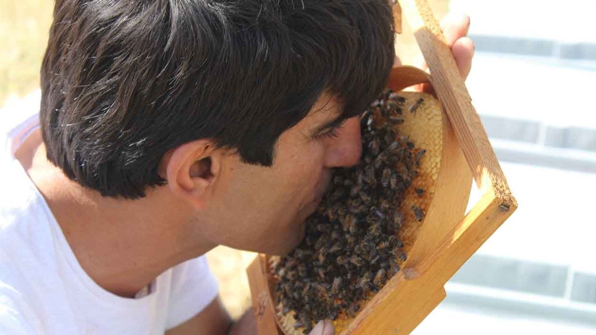 Hiçbir koruyucu ekipman kullanmadan kovanların yanına yaklaşan ve çıplak eliyle arılara dokunan Mikyas, arılardan hiçbir zarar görmüyor.
