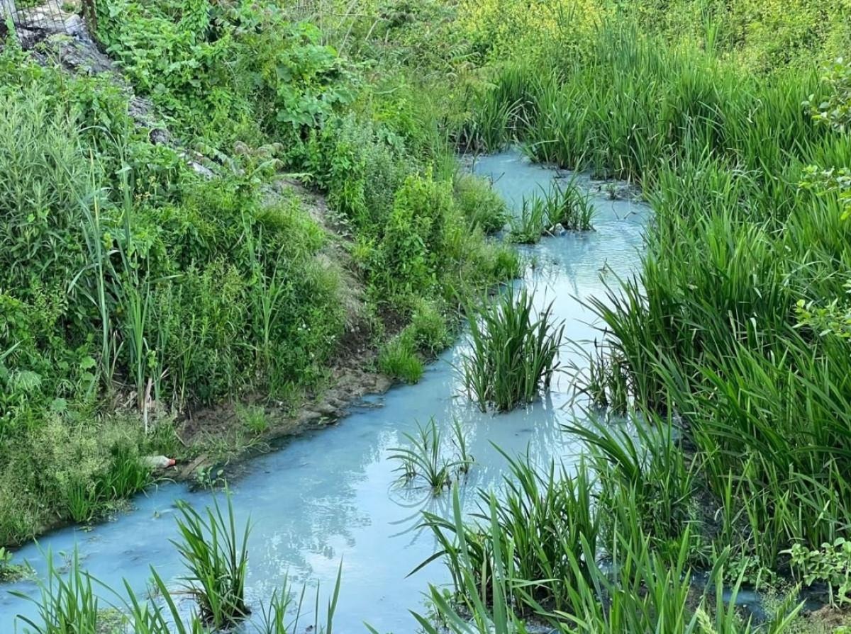 Etrafında hayvanların otladığı mahalle arasından geçen derenin rengi iddiaya göre, çevredeki dokuma fabrikalarının atık sularından dolayı maviye büründü.