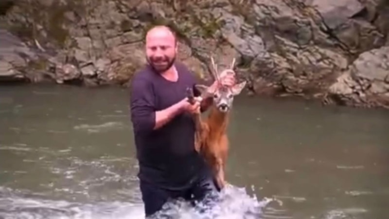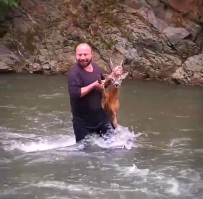 Artvin'in Borçka ilçesi Küçükköy Mahallesi Köroğlu mevkisinde yırtıcı hayvanlardan kaçarken İçkale deresine düşen yavru karacayı Borçka Belediyesi personeli Serdar Korkmaz, suya girerek kurtardı.
