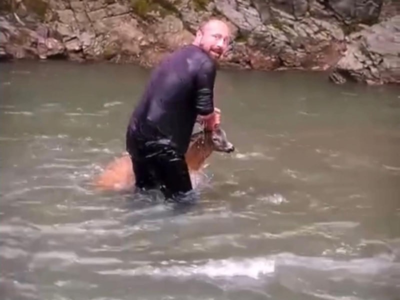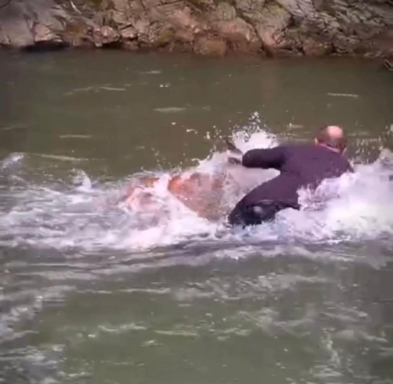 Korkmaz, suda çırpınan karacayı boynuz ve ayaklarından yakalayarak, karaya çıkardı.