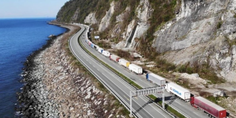 Türkiye'nin dört bir yanından gelen sürücüler tır parklarını doldurunca Karadeniz sahil yolu üzerinde bulunan yolun kenarına park ederek sıralarını bekliyor.