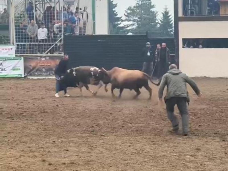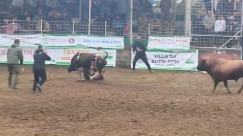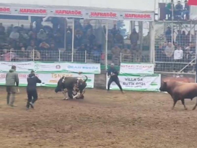 Artvin'de rakibinden kaçan boğanın bakıcısını boynuzla yere serdiği anlar görüntülendi.