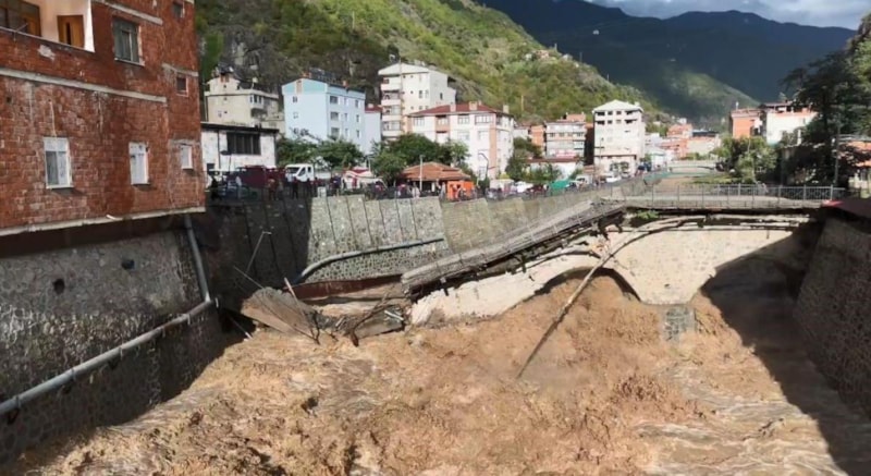 Yağışın en çok etkilediği ilçelerden biri olan Borçka’da Aksu Deresi’nin taşması sonucu, derenin üzerinde bulunan ve ilçenin simgelerinden biri sayılan asırlık tarihi köprü sel sularına dayanamayarak yıkıldı.