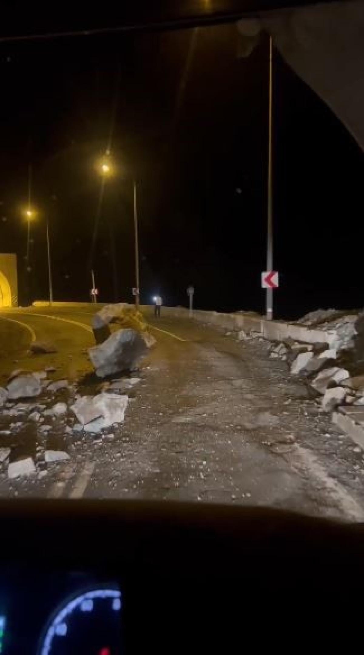 Yamaçtan kopan dev kayalar tünel girişine düştü. Yamaçtan kopan dev kaya parçaları, tünel girişini kapatarak yolun çift yönlü olarak trafiğe kapanmasına neden oldu.