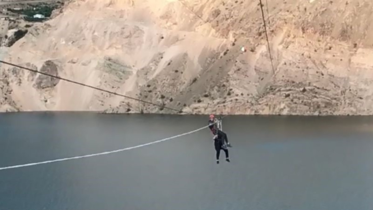 Yusufeli Barajı gölünün iki yakası arasına bin 174 metre uzunluğundaki, baraj gölü üzerinde Türkiye'nin en uzun hattında olma özelliğine sahip olan zipline deneme geçişi Belediye Başkanı Eyüp Aytekin tarafından yapıldı.