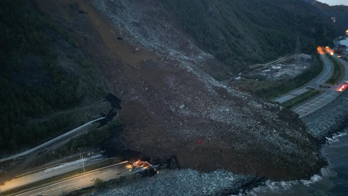 Heyelan nedeniyle yamaçtan kopan dev toprak ve kaya kütleleri Karadeniz Sahil Yolunun çift yönlü olarak ulaşıma kapanmasına neden oldu.
