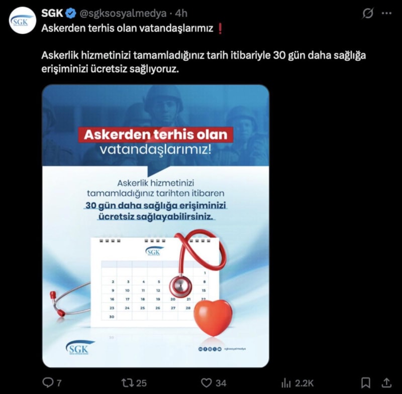 Sosyal Güvenlik Kurumu (SGK), resmi sosyal medya kanalları üzerinden yaptığı son açıklamayla askerlik görevini tamamlayıp terhis olan vatandaşlara yönelik dikkat çeken bir bilgilendirme yayımladı.