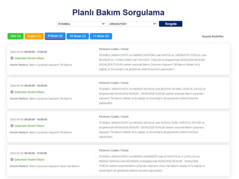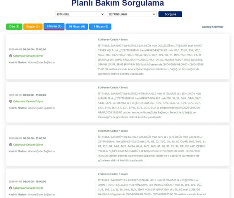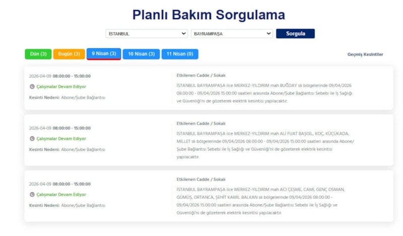 Boğaziçi Elektrik Dağıtım A.Ş. (BEDAŞ), 9 Nisan 2026 tarihli kesinti programını paylaştı. Açıklamaya göre, Avrupa Yakası’nda birçok ilçeyi kapsayan kesintiler olacak.