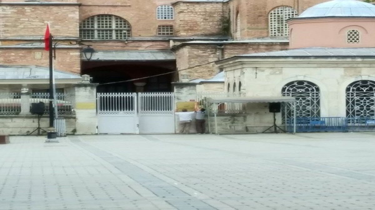 Ayasofya Camii'nin hemen girişinde bulunan Kültür ve Turizm Bakanlığı'nın müze tabelası, restorasyon çalışmaları kapsamında bu sabah söküldü.
