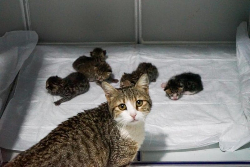 Didim'de doğum yapmak üzere olan bir sokak kedisi, bir veteriner kliniğine sığındı. Kedinin hamile olduğunu fark eden veteriner hekimler hemen yardımcı oldu. Kedi, klinikte 5 yavru dünyaya getirdi.