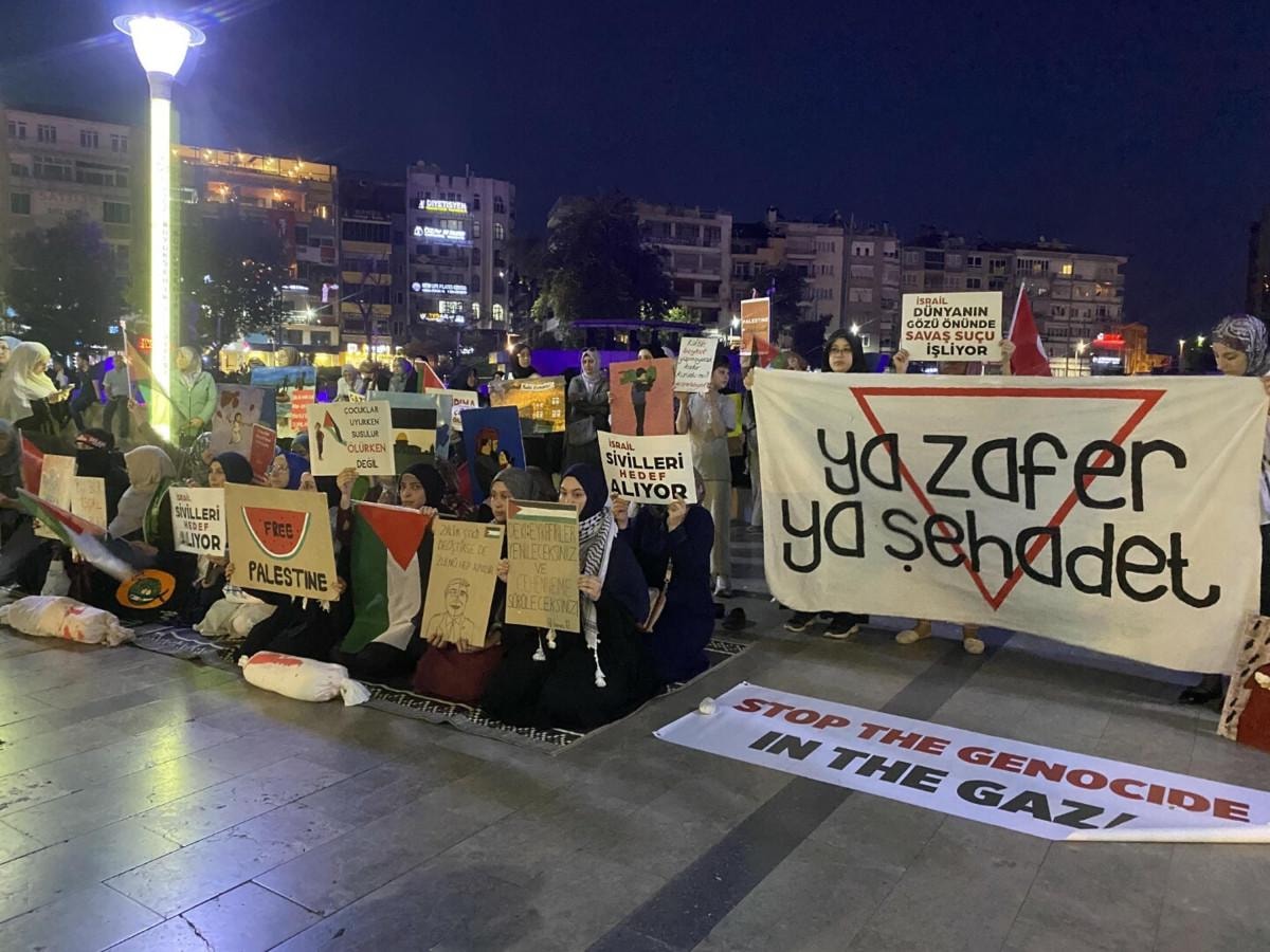 Atatürk Kent Meydanı’nda bir araya gelen vatandaşlar, 'İsrail sivilleri hedef alıyor', 'çocuklar uyurken susulur ölürken değil' ve 'Free Palestine' dövizleri açıldı.