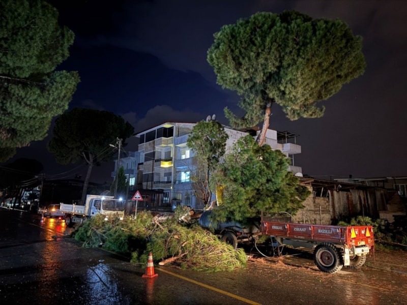 Şirinevler Mahallesi Beşeylül Caddesi'ndeki bir çam ağacı şiddetli fırtına nedeniyle kökünden devrilirken, elektrik tellerini de kopardı.