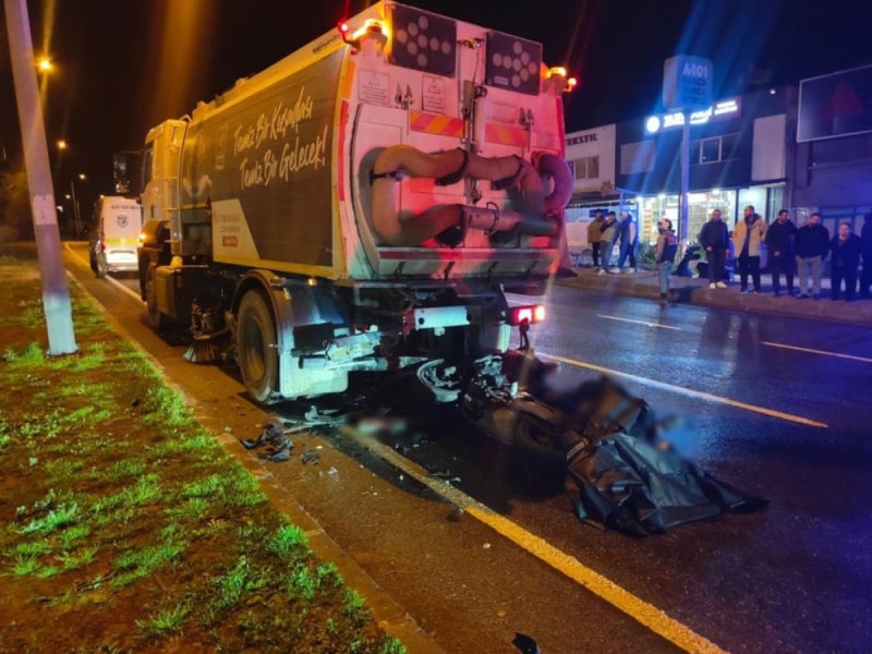 Aydın'ın Kuşadası ilçesi Süleyman Demirel Bulvarı'nda yarış halinde oldukları iddia edilen motosiklet sürücülerinden biri yolun sol şeridinde ikaz lambaları açık şekilde yol temizliği yapan kamyona çarptı.