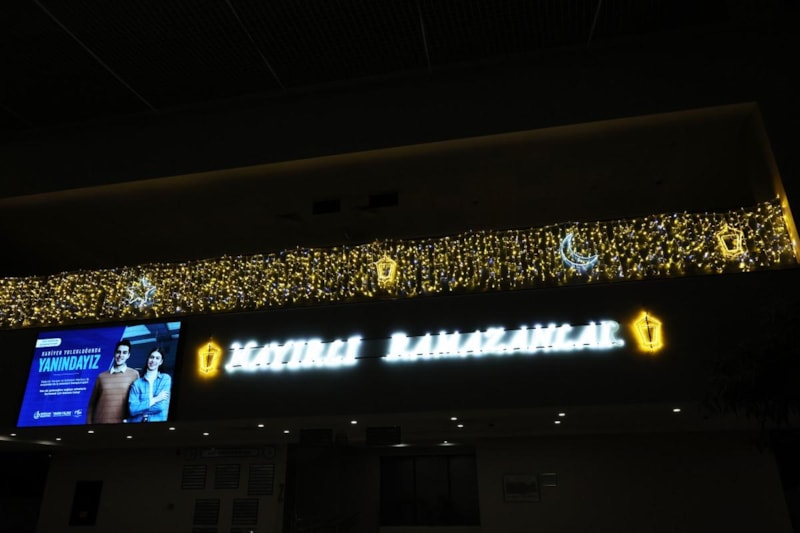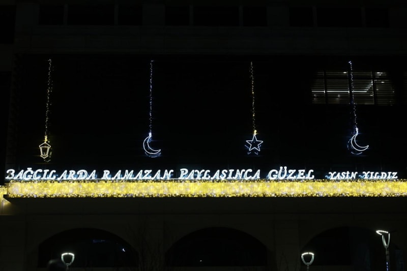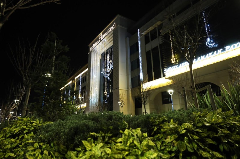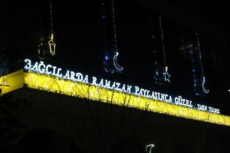 "Bağcılar'da Ramazan paylaşınca güzel" sloganı Bağcılar Belediyesi binasının dışında yer alırken binanın zemin katında da "Hayırlı Ramazanlar" ışıklandırmaları yer aldı.