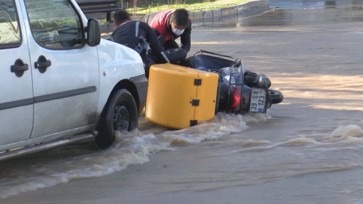 Suyun bastığı yolu gören bir motosiklet sürücüsü, bir süre sağa yanaşarak bekledi. Daha sonra hareket eden motosikletli kısa süre sonra suya kapılarak düştü.
