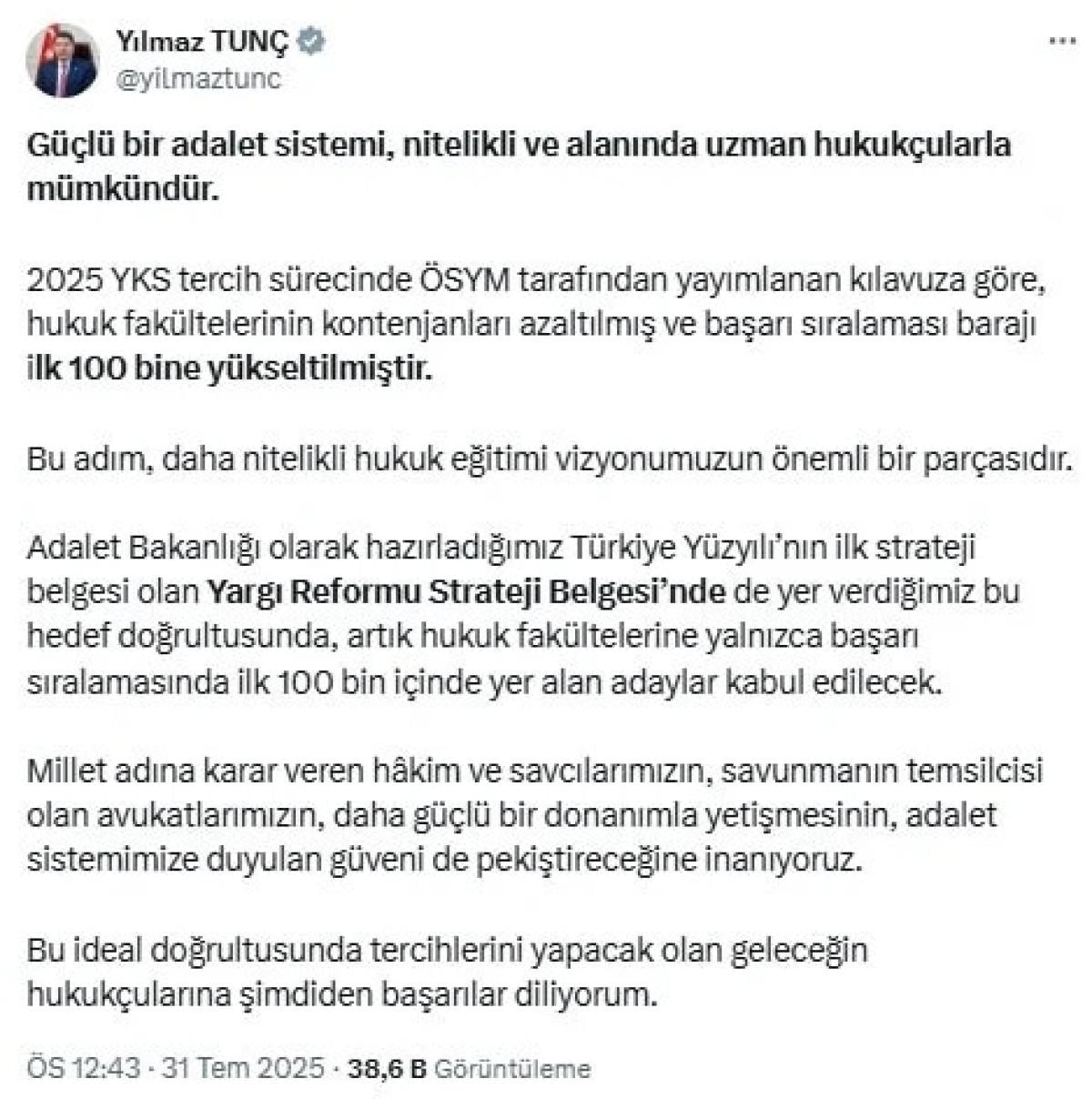 Bakan Tunç sosyal medya hesabından yaptığı paylaşımda, yeni düzenlemeye birlikte artık hukuk fakültelerine yalnızca ilk 100 bin içerisinde yer alan adaylar kabul edilecek.