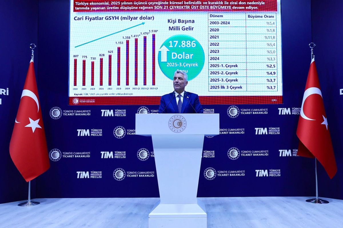 - Ticaret Bakanı Ömer Bolat, ihracatın büyümeye önemli katkı sağladığını ve dış ticarette rekorların kırıldığını belirterek ekonomi politikalarının bu yönde desteklendiğini vurguladı.