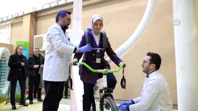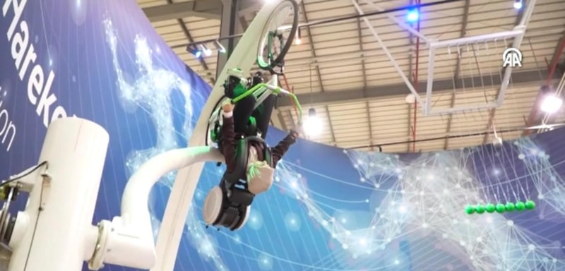 El ve ayak bileklerinden bağlandığı bisikletle pedal çevirerek 360 derece dönüş gerçekleştiren Bakan Göktaş'ın G Kuvveti Bisikleti deneyimi salondakiler tarafından ilgiyle takip edildi.
